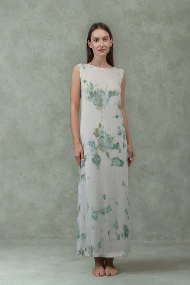A refined and contemporary silhouette, this sleeveless long dress is crafted in our signature Orange Fabric and fully Lined in breathable Bemberg Satin for a smooth, weightless feel on the skin. The base color, Ivory Blossom, becomes a canvas for an entirely Hand-Painted artwork in soft green and teal tones, creating a one-of-a-kind botanical impression. Designed to be worn alone for an understated statement or layered under an overcoat or abaya, it transitions effortlessly from day to evening while maintaining an aura of quiet luxury.