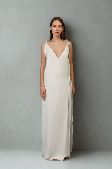 A refined, floor-length evening dress crafted from Orange Fabric, an innovative sustainable fabric made from citrus by-products. With its natural silk-like sheen, fluid drape, and exceptional breathability, the dress embodies modern simplicity elevated through premium materials. The minimalist sleeveless silhouette features delicate Spaghetti Straps and a deep, feminine V-neckline, offering timeless elegance and effortless lightness.