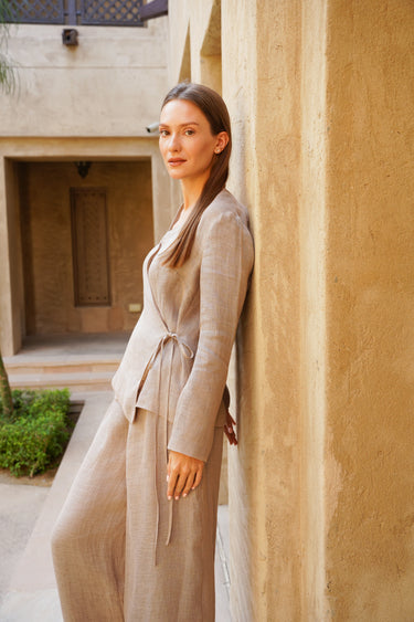 A lightweight and architecturally refined wrap jacket crafted from hemp mesh, designed to embody understated luxury and conscious elegance. Presented in the soft, mineral Velvet Stone shade, the fabric reveals a naturally textured surface with subtle transparency and exceptional breathability. The wrap construction is secured with a delicate self-fabric string closure, allowing the silhouette to be adjusted effortlessly while maintaining a clean, fluid line.