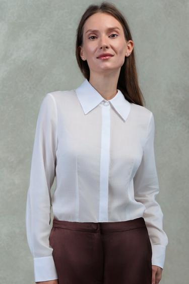 The design features a sharp pointed collar, elongated cuffs, and a fully concealed placket with fabric-covered buttons, ensuring a seamless, minimalist front. Lightly structured yet fluid, the shirt delivers a polished, modern look ideal for both professional wear and elevated everyday styling. Its natural white tone (no dye) highlights the purity of the fiber and pairs beautifully with any of our skirts, trousers, or outerwear pieces.