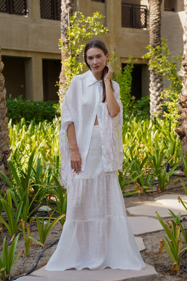A beautifully ethereal skirt crafted from lightweight Hemp Mesh Fabric, designed to showcase the fabric’s natural transparency and airy movement. The silhouette is long and softly tiered, creating gentle volume without heaviness.
