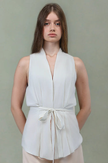 A soft, sculptural take on minimal elegance, this sleeveless top is crafted from pure Banana Fabric, presented in its Natural Undyed White Tone. The design features a delicate pleated front that creates vertical movement and subtle texture, enhancing the refined drape of the fabric.