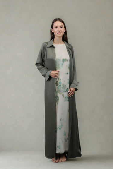 A graceful reinterpretation of the classic trench silhouette, this long overcoat is crafted from Orange Fabric, an innovative sustainable fabric made from citrus by-products and celebrated for its silk-like sheen, fluid drape, and natural breathability. The serene Shadow Green Hue enhances the coat’s refined presence, creating a timeless outerwear piece with elevated movement and lightness.