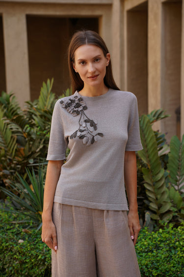 A naturally elegant knitted Linen T-Shirt, elevated by delicate Hand-Made Crochet Flowers placed asymmetrically on the shoulder. Dyed with Natural Dyes, the piece carries soft earthy tones that highlight the raw beauty of natural fibers. The lightweight knit drapes gently on the body, offering comfort, breathability and an effortless refined look. Each crochet flower is crafted entirely by hand, bringing texture, artistry and uniqueness to this understated silhouette.