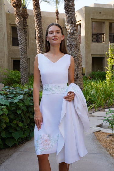 The waist is accented by a wide, Hand-Painted Belt, meticulously illustrated by artisans with delicate botanical motifs. This signature detail transforms the dress into a piece of wearable art, harmonizing perfectly with the matching overcoat. Subtle Hand-Painted Florals at the hem complete the composition, offering balance, grace, and a unique artisanal touch.
