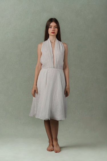 Crafted from airy Hemp Mesh Fabric, this halter pure white dress embodies effortless elegance with a naturally fluid drape. The deep V neckline elongates the silhouette while maintaining an understated, contemporary femininity. The waistline is clean and structured, opening into a soft A-line skirt that moves gracefully with every step.
