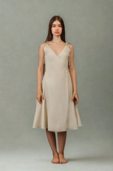 The dress is fully Lined in natural, undyed Bemberg Satin, a sustainable cellulose fiber chosen for its smooth, breathable, and moisture-regulating qualities. Together, the fabrics create a luxurious second-skin feel, ideal for warm climates, resort evenings, or intimate occasions where natural beauty speaks louder than embellishment.