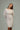 The upper body features a soft, slightly structured shape with a gentle boat neckline and three-quarter sleeves, balancing coverage with lightness. The waist is beautifully defined through the contrast of lined top, unlined midsection, and lined skirt, creating an effortless hourglass effect. The skirt falls just above the knee with a clean, minimalist finish, emphasizing the purity of the hemp fabric and its natural texture.